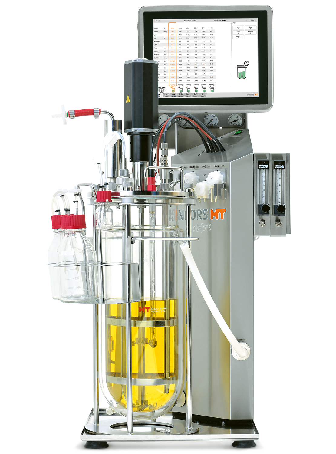 Этот биореактор предназначается для выполнения рутинных задач в биотехнологии, и будет удачным решением для лабораторий, начинающих переход от культивирования в колбах к контролируемому культивированию в биореакторе. Помимо контроля стандартных параметров (температура, перемешивание, автоматическая подача газов, рН, растворенный кислород), есть возможность оснастить Minifors высокотехнологичными аксессуарами – анализатором газов О2 и СО2, датчиком плотности живых клеток и весами для гравиметрической подпитки.