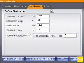 Удобно осуществлять очистку в нерабочее, ночное время. На следующий день, биореактор сразу готов к очередному процессу культивирования. Данный способ очистки соответствует стандартам GMP. Например, стерилизация Labfors 5 горячим раствором гидроксида натрия и окончательное ополаскивание стерильной водой (интегрированный стерильный фильтр) выполняется автоматически. В цикл промывки включены все детали биореактора, включая систему подачи воздуха и дренажную систему. Типичные условия стерилизации 60 °С, рН 12.8, продолжительностью 3 ч. Особенности системы LabCIP: