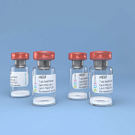 Форма выпуска эпидермального фактора роста человека, рекомбинантного белка, rhEGFЛиофильно высушен из фосфатного буферного раствора PBS, содержащего 0,05% Tween 20, pH 7,0, профильтрованного через фильтр с диаметром пор 0,22 мкм. Применение эпидермального фактора роста человека, рекомбинантного белка, rhEGFРекомбинантный белок rhEGF человека стимулирует пролиферацию клеток линии NIH-3T3 (эмбриональные мышиные фибробласты). Значение ED50 для данного эффекта обычно составляет 0,2 - 0,7 нг/мл. Оптимальная концентрация для индивидуального применения определятся пользователем. Разведение эпидермального фактора роста человека, рекомбинантного белка, rhEGFЦентрифугировать флакон при 1000 rpm, 3 мин; добавить стерильный буферный раствор (PBS) до конечной концентрации 0,1-1 мкг/мкл; оставить на 20-30 мин при комнатной температуре, затем центрифугировать при 1000 rpm в течение 1 мин, и мягко ресуспендировать. Для приготовления рабочих растворов можно использовать буфер на водной основе или культуральную среду. Добавление вспомогательных белков (BSA или FBS) не является необходимым. Условия хранения и транспортировки эпидермального фактора роста человека, рекомбинантного белка, rhEGFСтабильность и условия хранения: